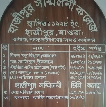 অধ্যক্ষ/সদস্য সচিবগণের নাম ও কার্যকাল ক্রুমিক নং নাম হইতে পর্যন্ত ১ দীনেশ চন্দ্র বিশ্বাস (ভারপ্রাপ্ত) 05/07/1999 28/08/1999 ২ মোঃ আতিকুল ইসলাম 24/08/1999 20/11/2023 ৩ ইঞ্জিনিয়ার সাঈদ রেজা তরুন (সদস্য সচিব) 26/11/1998 21/08/2023 ৪ মোঃ নাজমুল হাসান (ভারপ্রাপ্ত) 26/12/2023 08/09/2004 ৫ মোঃ মতিয়ার রহমান 08/09/2004 17/01/2017 হাজীপুর সম্মিলনী ডিগ্রি কলেজ ক্রুমিক নং নাম হইতে পর্যন্ত ১ মোঃ মতিয়ার রহমান 18/01/2017 14/06/2021 ২ কনক কান্তি সাহা (ভারপ্রাপ্ত) 15/06/2021